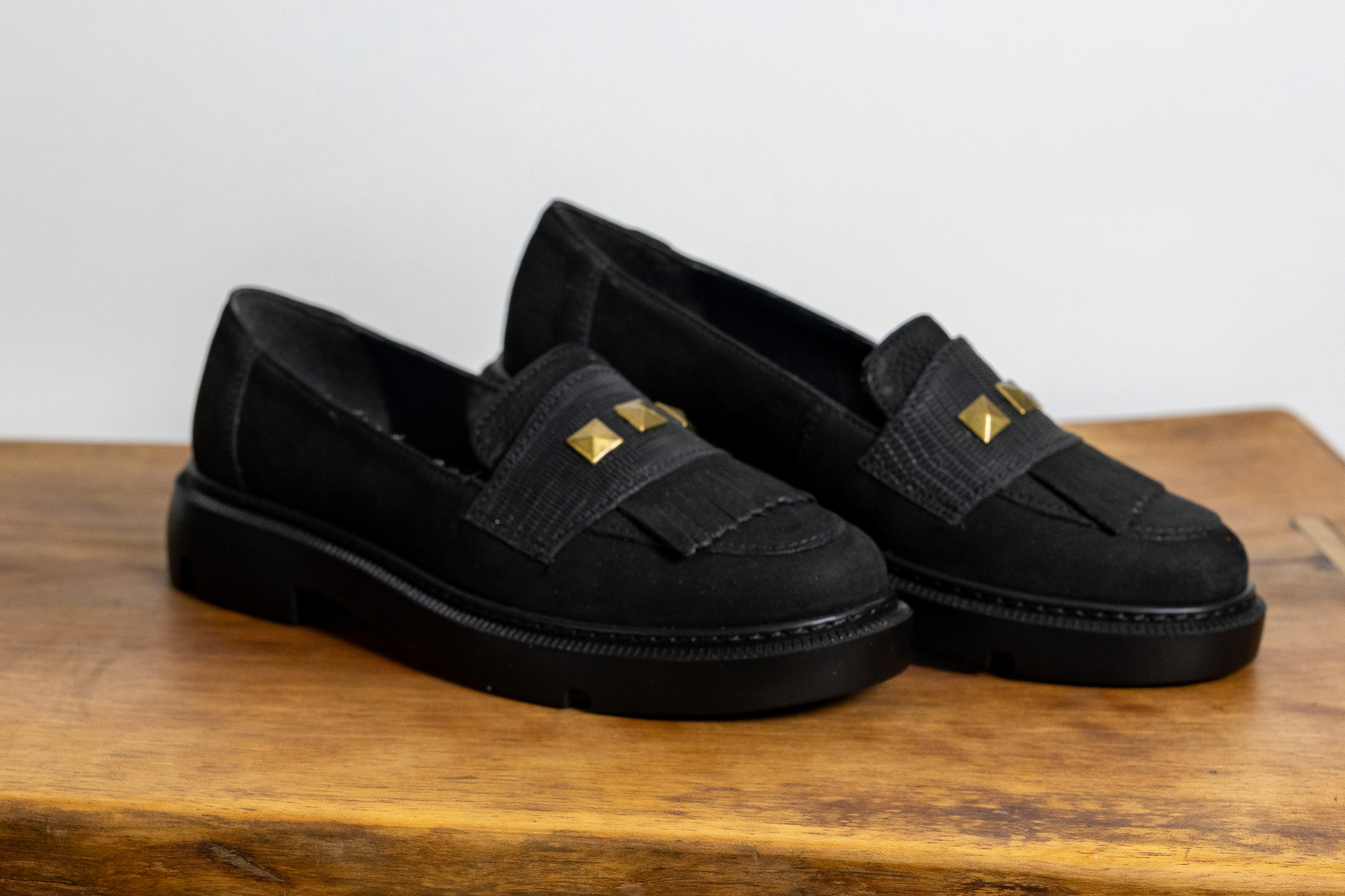 • Detalii: Culoare negru intens cu un finisaj mat tip nabuc/suede. Pantofii sunt accesorizați cu o baretă texturată și ținte metalice piramidale aurii, plus un detaliu discret de franjuri (kiltie) pentru un plus de rafinament.