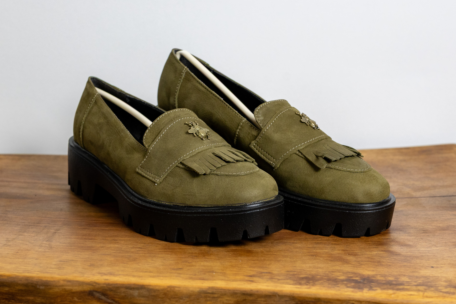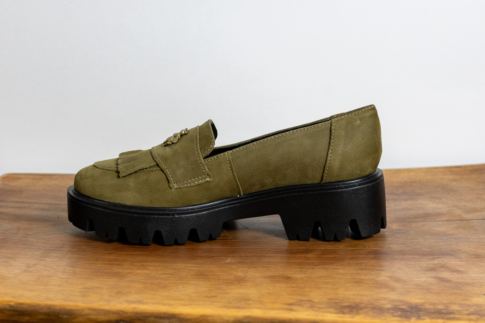 • Detalii: Culoare verde kaki (oliv) cu un aspect mat, elegant. Pantoful este decorat cu o baretă lată, un element metalic auriu ornamental și franjuri din piele (kiltie) care adaugă textură designului.